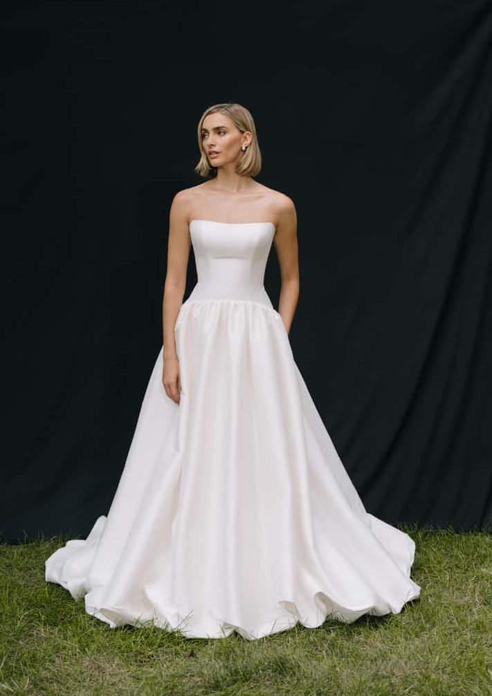Minimalist and simple wedding dresses with playful details in luxe satin, crepes, and more in figure-flattering silhouettes.
